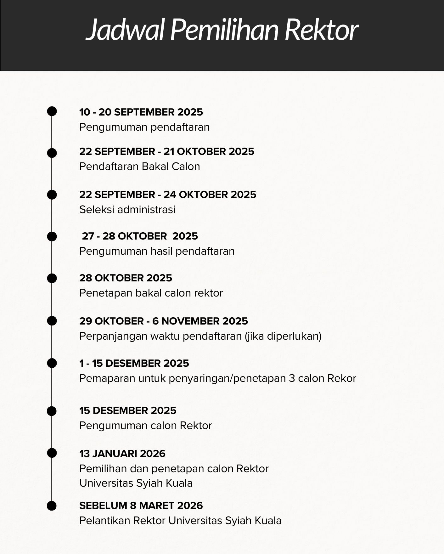 Sehubungan dilaksanakannya proses pemilihan Rektor, panitia menginformasikan jadwal resmi tahapan pemilihan kepada seluruh masyarakat. Proses ini mencakup penjaringan bakal calon, penyampaian visi, misi, dan program kerja, penyaringan, hingga pelantikan Rektor terpilih.
