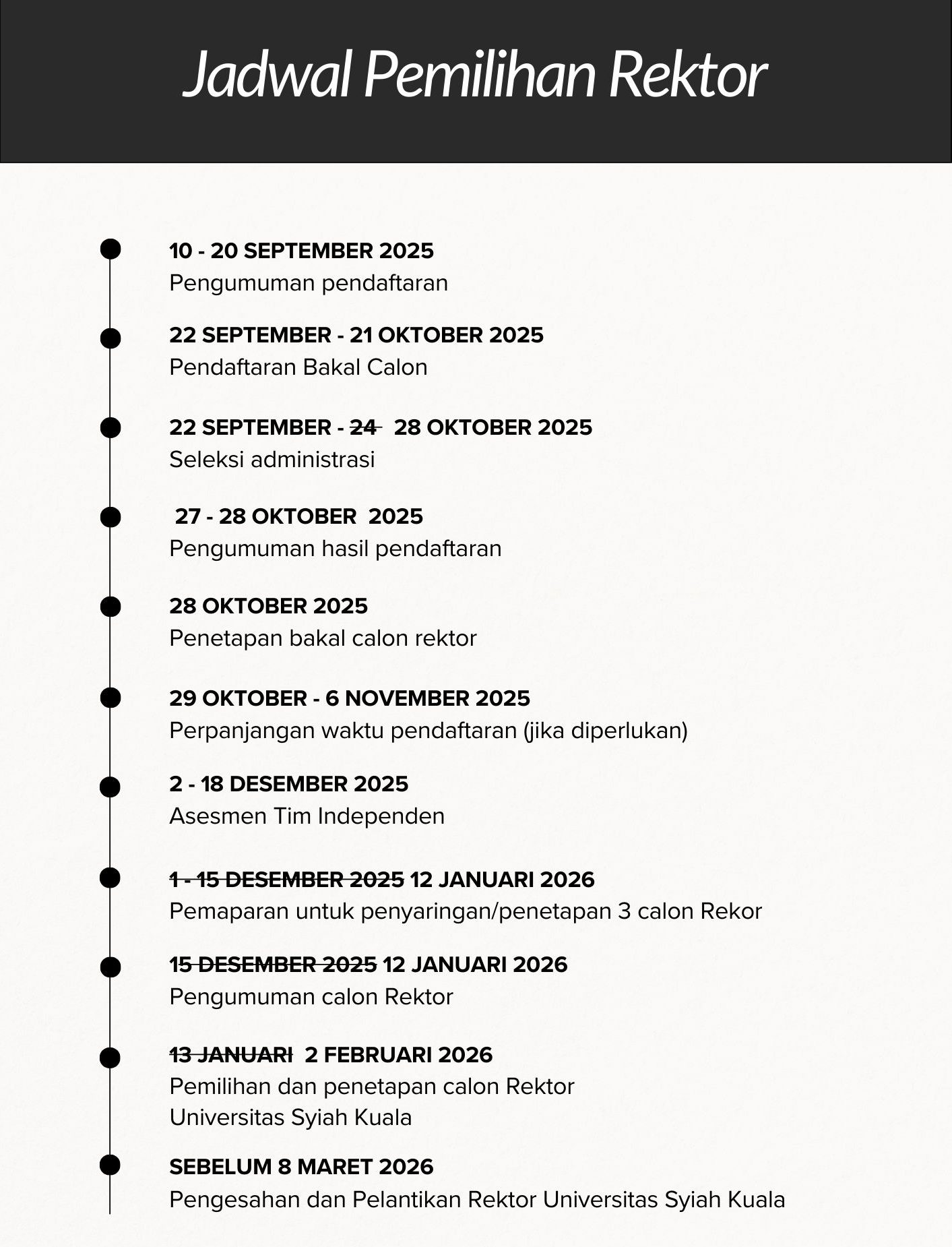 Sehubungan dilaksanakannya proses pemilihan Rektor, panitia menginformasikan jadwal resmi tahapan pemilihan kepada seluruh masyarakat. Proses ini mencakup penjaringan bakal calon, penyampaian visi, misi, dan program kerja, penyaringan, hingga pelantikan Rektor terpilih.